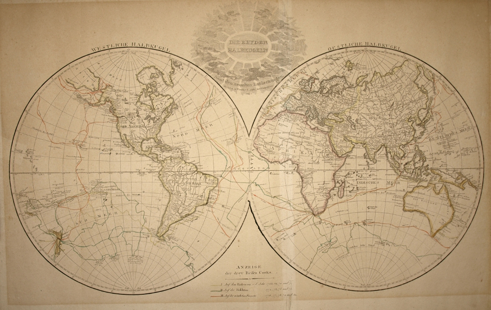 Die beyden Halbkugeln (westliche Halbkugel, oestliche Halbkugel) samt den neuesten Entdeckungen -- Anzeige der drey Reisen Cooks / Franz von P. Reißer [Stecher]